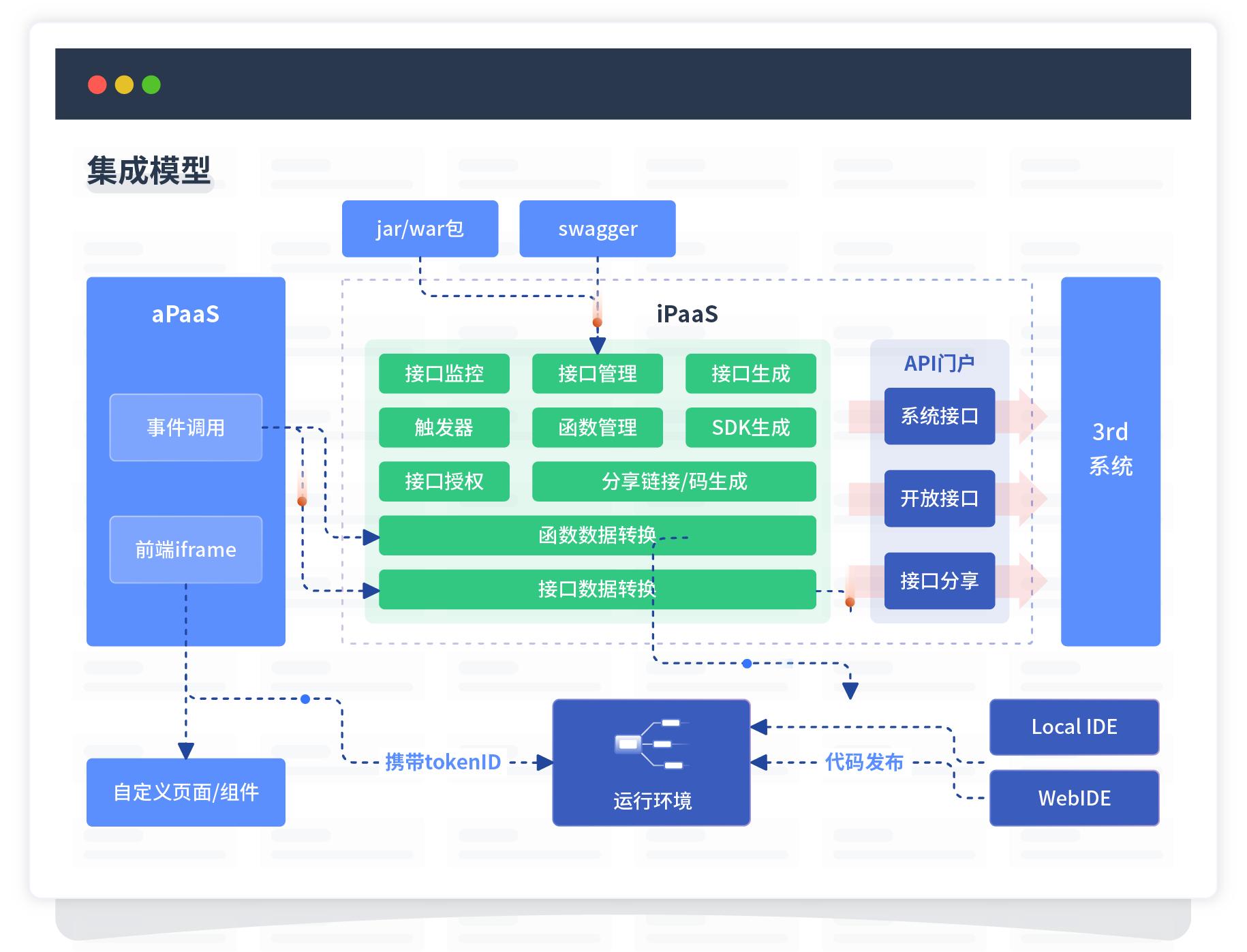 集成模型包括平台本身前、后端能力的扩展,也支持通过API门户和第三方系统进行交互。